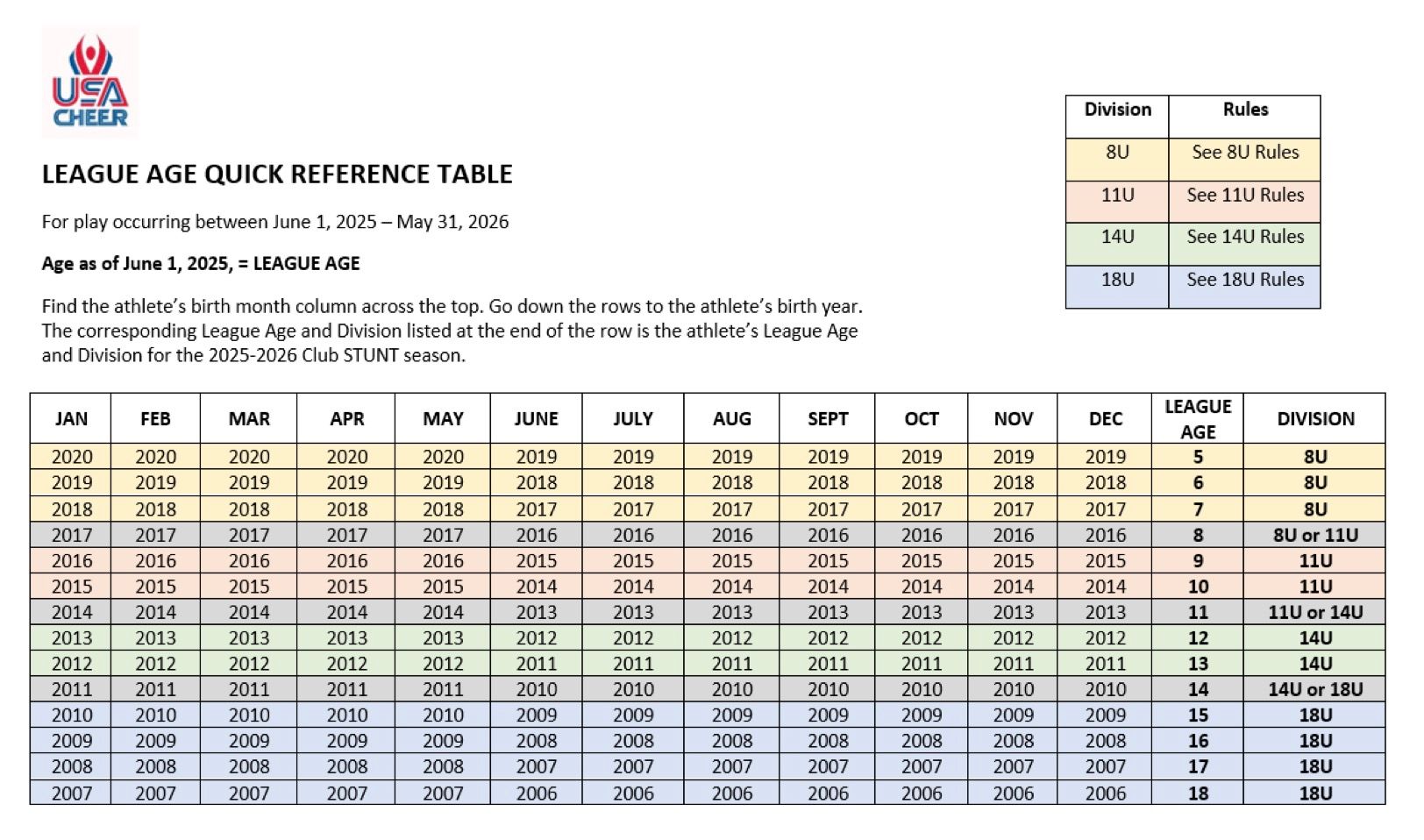 Team placement will be determined by the following age grid: